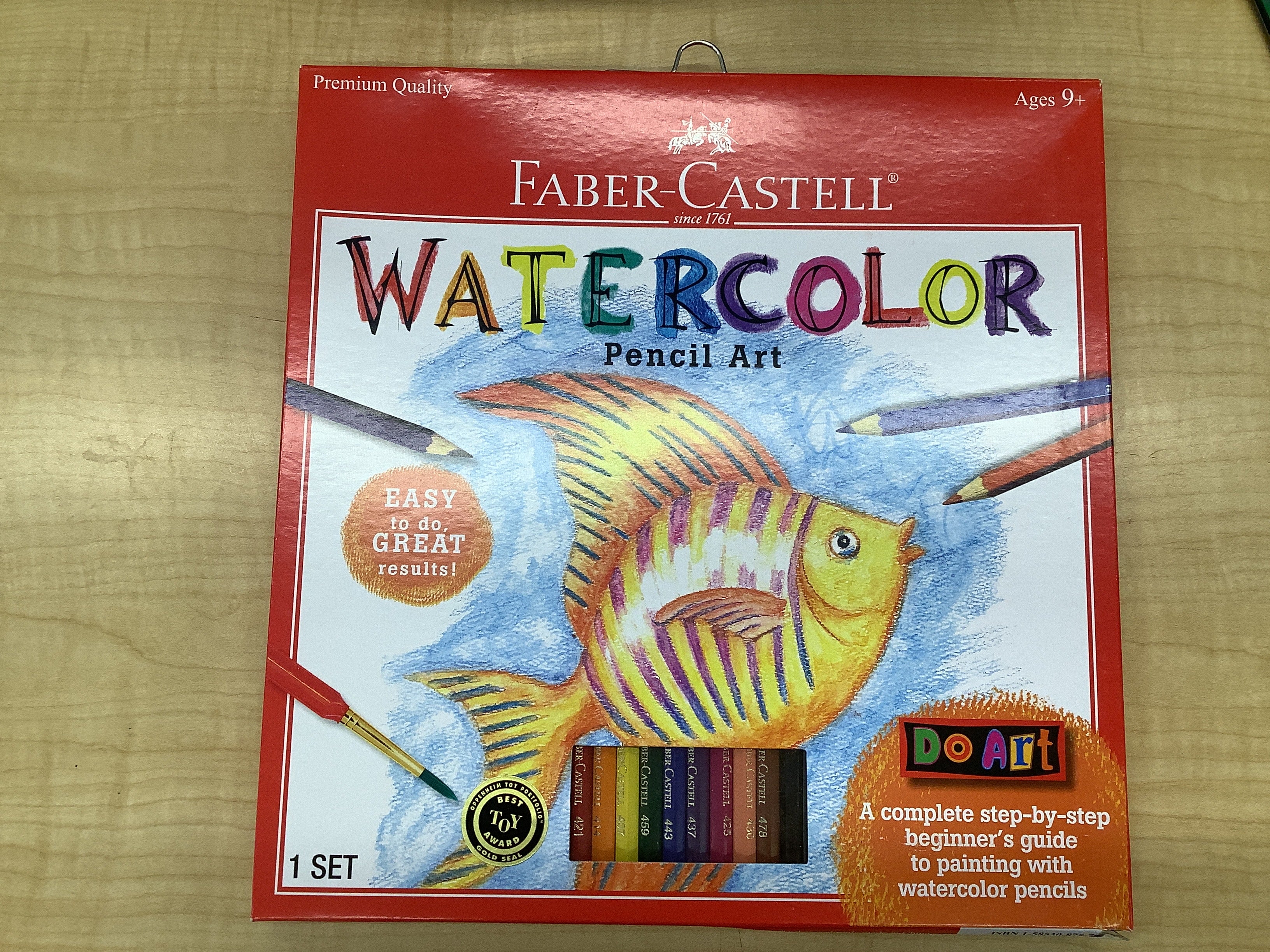 This is a kids quality pencil set containing 10 colored watercolor pencils, an instruction book, and a sheet of watercolor paper.