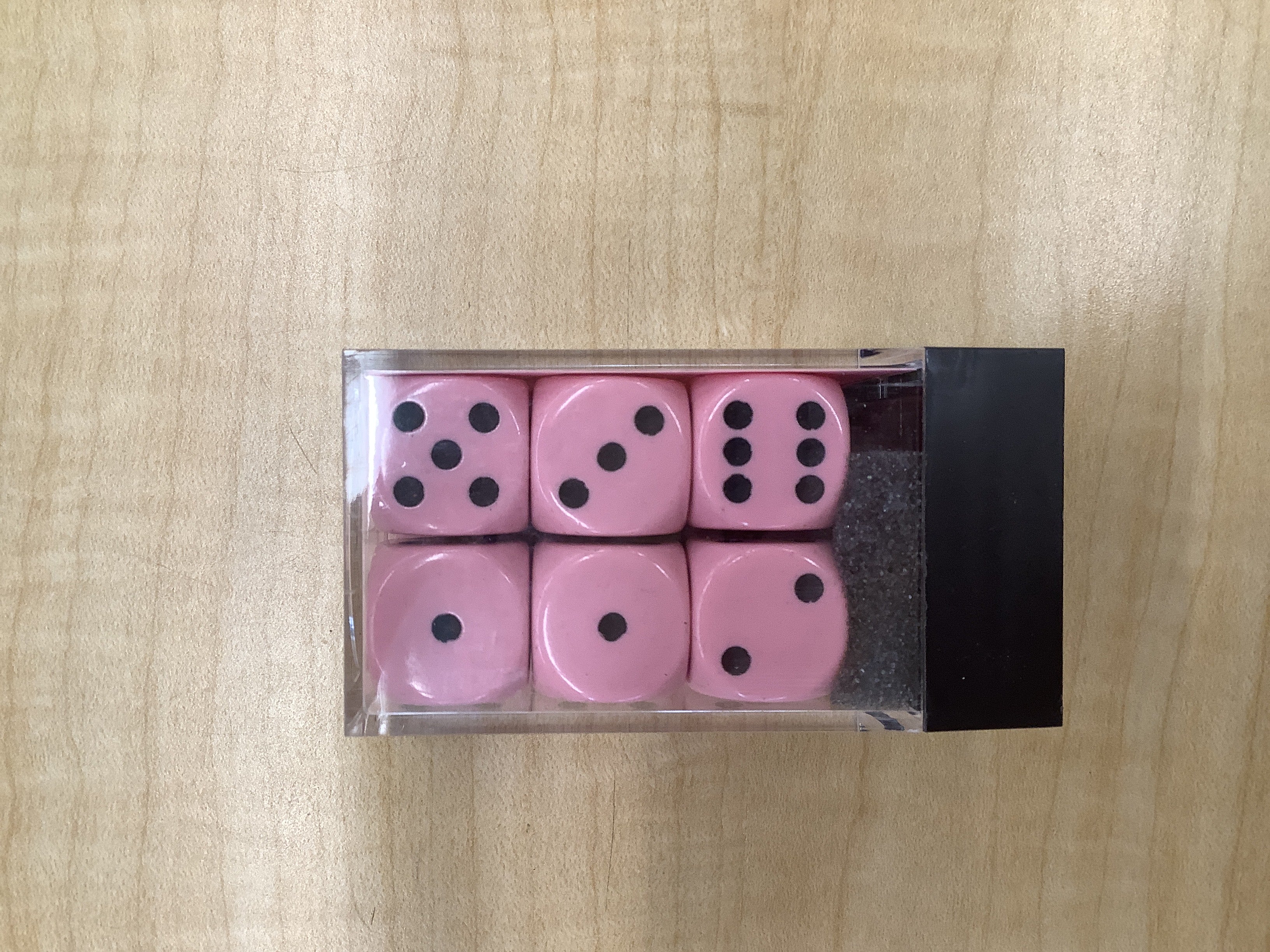 Pastel pink/black six sided dice is backordered and will ship as soon as it is back in stock.